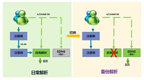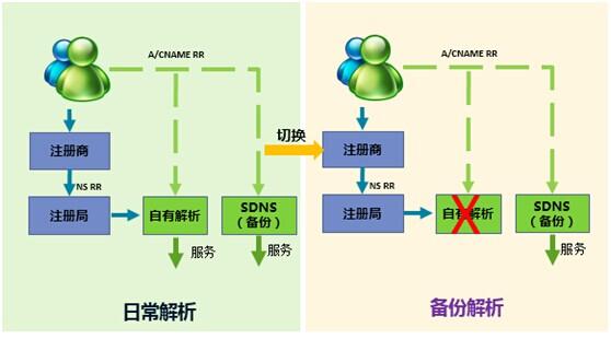 用戶域名的權威解析數據備份至云解析平臺。正常情況下由用戶的自建權威服務器提供解析服務。當遭遇突發情況或需進行服務遷移時,用戶可修改NS記錄指向SDNS權威云服務平臺,由SDNS權威云服務繼續提供域名的解析。