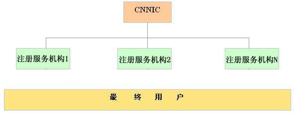 根據《中國互聯網絡域名管理辦法》的規定,CNNIC在2002年12月16日全面變革域名管理服務模式:CNNIC作為CN域名注冊管理機構,不再直接面對最終用戶提供CN域名注冊相關服務,域名注冊服務將轉由CNNIC認證的域名注冊服務機構提供。注冊服務機構管理體系結構圖如下: