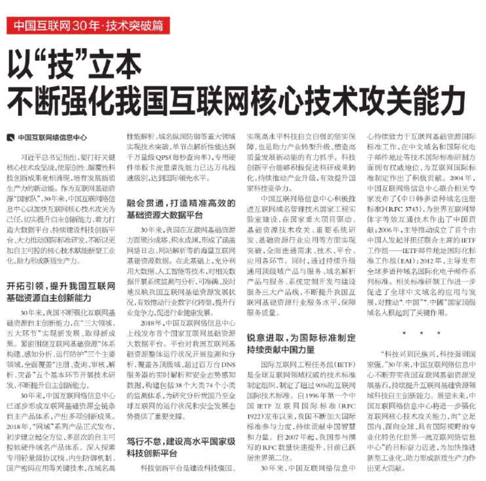 習近平總書記指出,要打好關鍵核心技術攻堅戰,使原創性、顛覆性科技創新成果競相涌現,培育發展新質生產力的新動能。作為互聯網基礎資源“國家隊”,30年來,中國互聯網絡信息中心以加快互聯網核心技術攻關為己任,切實提升自主創新能力、著力打造大數據平臺、持續建設科技創新平臺、大力推動國際標準研發,不斷以更加自主可控的核心技術賦能新型工業化,助力形成新質生產力。
