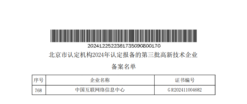 2024年12月25日,全國高新技術企業認定管理工作領導小組辦公室公布第三批高新技術企業備案名單,中國互聯網絡信息中心成功通過認定。