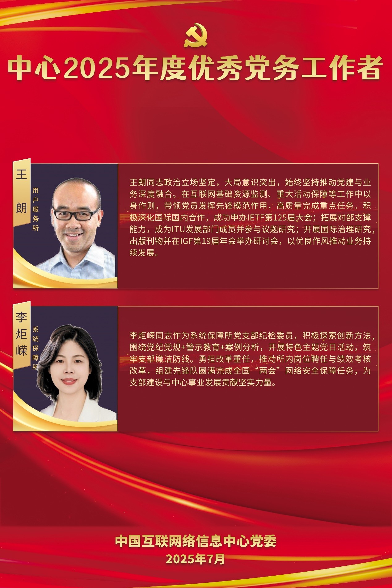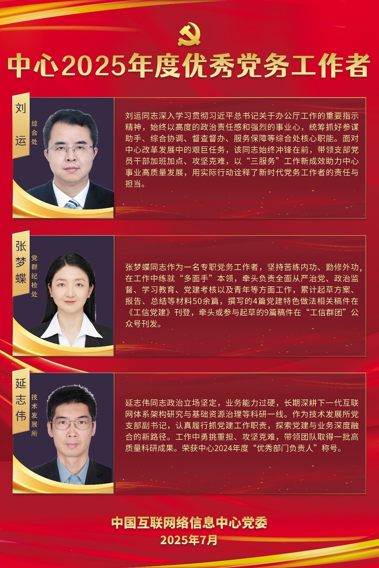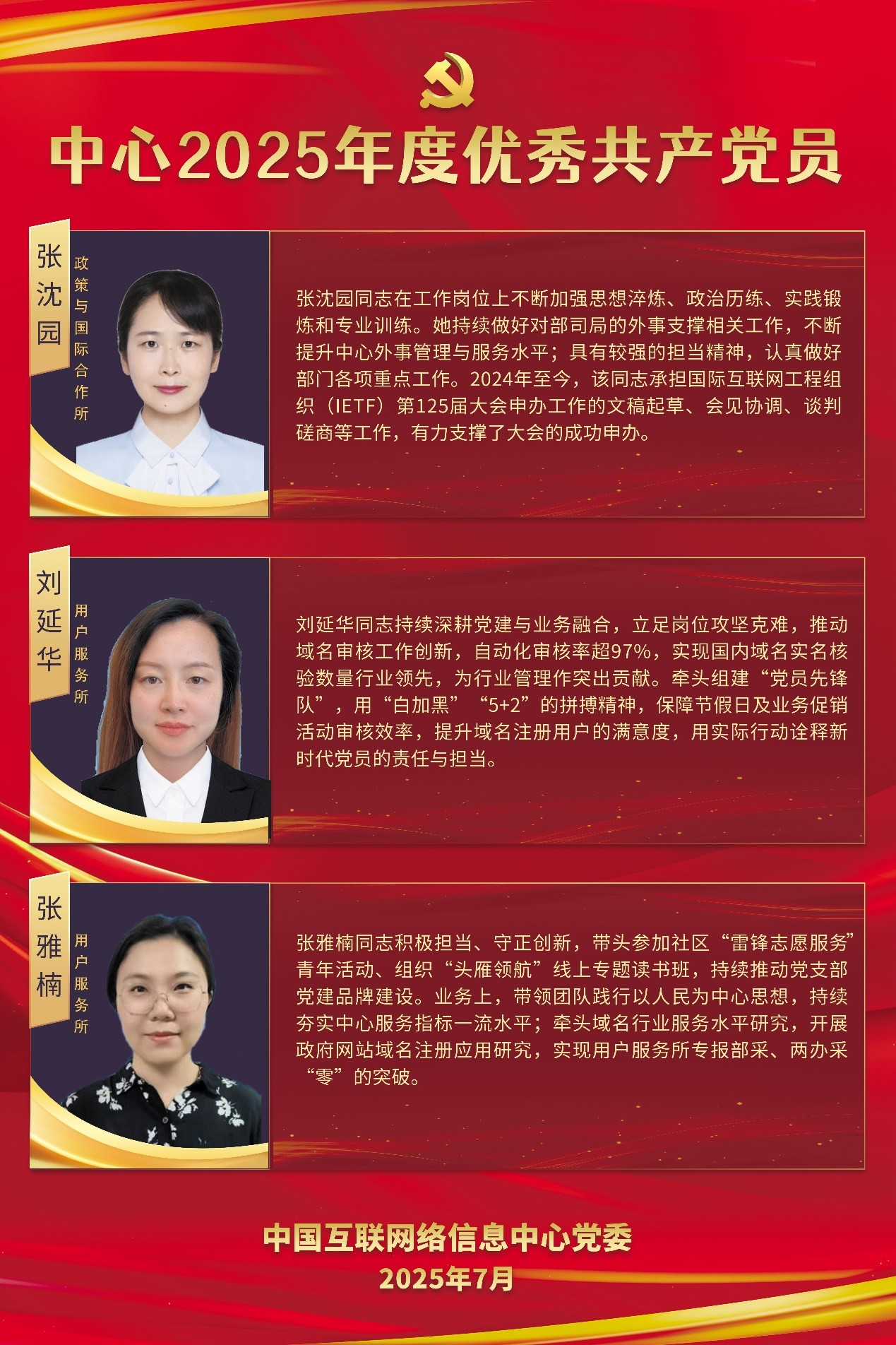 為慶祝中國共產黨成立104周年,中國互聯網絡信息中心黨委隆重表彰18名優秀共產黨員和5名優秀黨務工作者。7月,特開設“初心如磐、奮楫篤行”先進事跡專欄,展現他們忠誠擔當的政治品格、敬業奉獻的優良作風,激勵廣大黨員干部職工以更加強烈的使命擔當、更加飽滿的精神狀態,銳意進取、擔當作為,為推動互聯網基礎資源高質量發展貢獻智慧和力量,為扎實推進新型工業化、加快建設制造強國和網絡強國不懈奮斗!