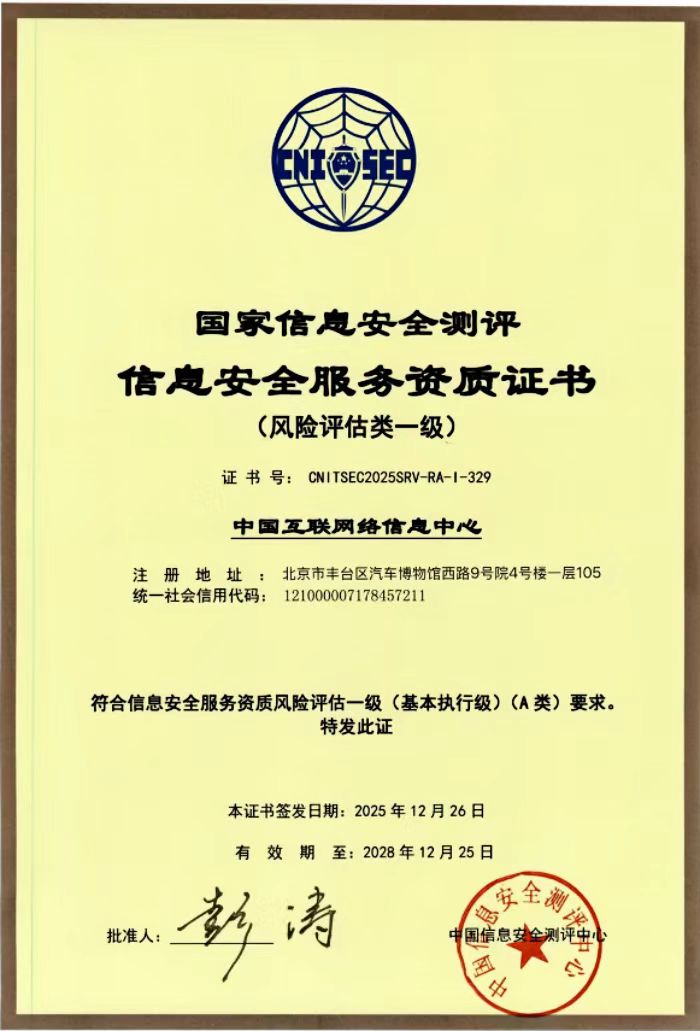 12月26日,中國互聯網絡信息中心獲得由中國信息安全測評中心頒發的國家信息安全服務(風險評估類一級)資質證書,標志著中心在強化信息安全服務能力建設方面取得新進展。